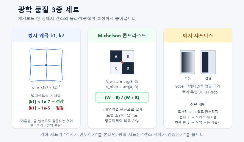 이건 격자의 기하학적 반듯함이 아니라, 렌즈 자체의 물리적/광학적 특성입니다. 이번 편에서 다룰 세 지표가 정확히 이 영역을 담당합니다.
